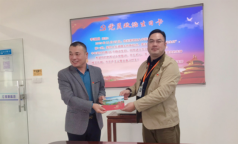 第二項議程是給黨員過政治生日。為加強黨員理想信念教育,提醒每位黨員不忘入黨初心,錦蕭科技黨支部沈秋良書記為11月過政治生日黨員李國昌同志贈送政治生日賀卡。