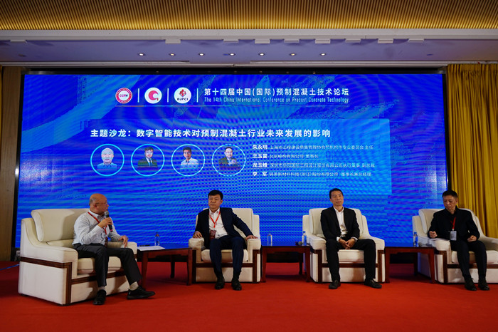 最后的主題沙龍環節,上海市工程建設質量管理協會預制構件專業委員會主任朱永明,北京榆構有限公司董事長王玉雷,深圳市華陽國際工程設計股份有限公司執行董事、副總裁龍玉峰,錦蕭新材料科技(浙江)股份有限公司總工程師王建忠,4位專家圍繞“數字智能技術對預制混凝土行業未來發展的影響”這一主題,結合實戰經驗,圍繞數智技術、綠色技術的發展對裝配式產業未來的影響,各抒己見,給出了中肯的意見和建議。